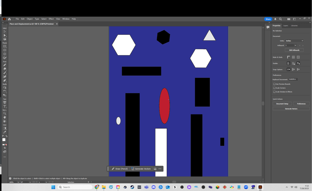 So for my Illustrator project, I made this abstract image called Red is Alone Again. The background is this deep purple color, kind of muted and dark, and I added a bunch of geometric shapes scattered around it. I wanted something that drew your eyes toward the center of the piece. I also wanted it to give a sense of isolation.