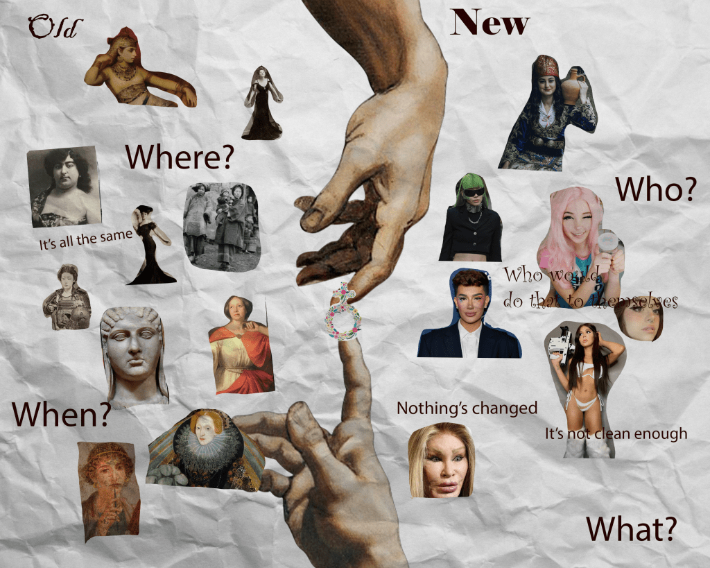 This piece is a collage about the old and new definitions of attractiveness. I put the female symbol in the middle as a symbol that attractiveness and beauty has always been in the court of women and how men judge them. I also included different beauty standards that cause damage or harm. There are also some general conventions of beauty that exist here as well.