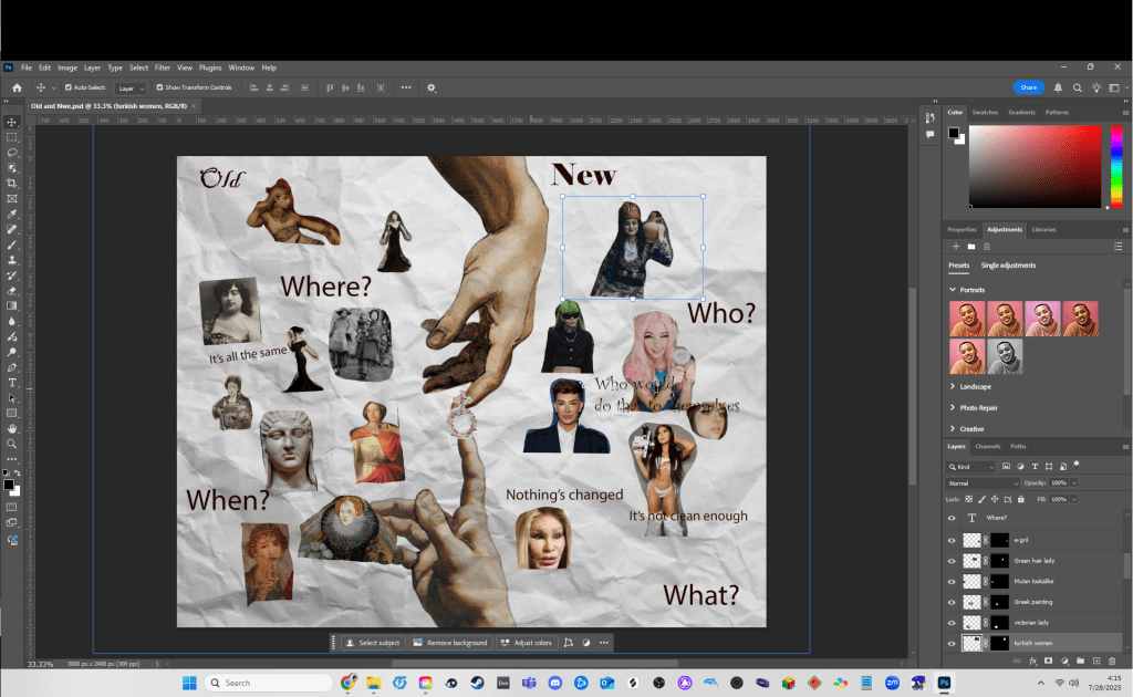 My Photoshop project is a collage style piece inspired by Dadaism. The image shows the famous scene of God and Man almost touching hands, running vertically down the middle. The background looks like crumpled paper, which gives it a rough, real texture that contrasts with the smooth portraits on each side.